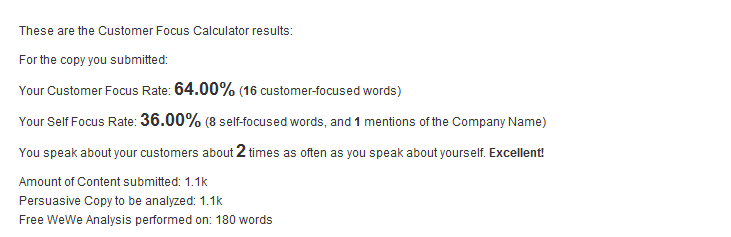 Friends, I am guilty of it too. I went to this site to test how my copy stood up to the we vs. you test. It turned out that my copy spoke more about M19 MEDIA (60%) than my user (40%). Some tweaks to the copy, and I came up with this: